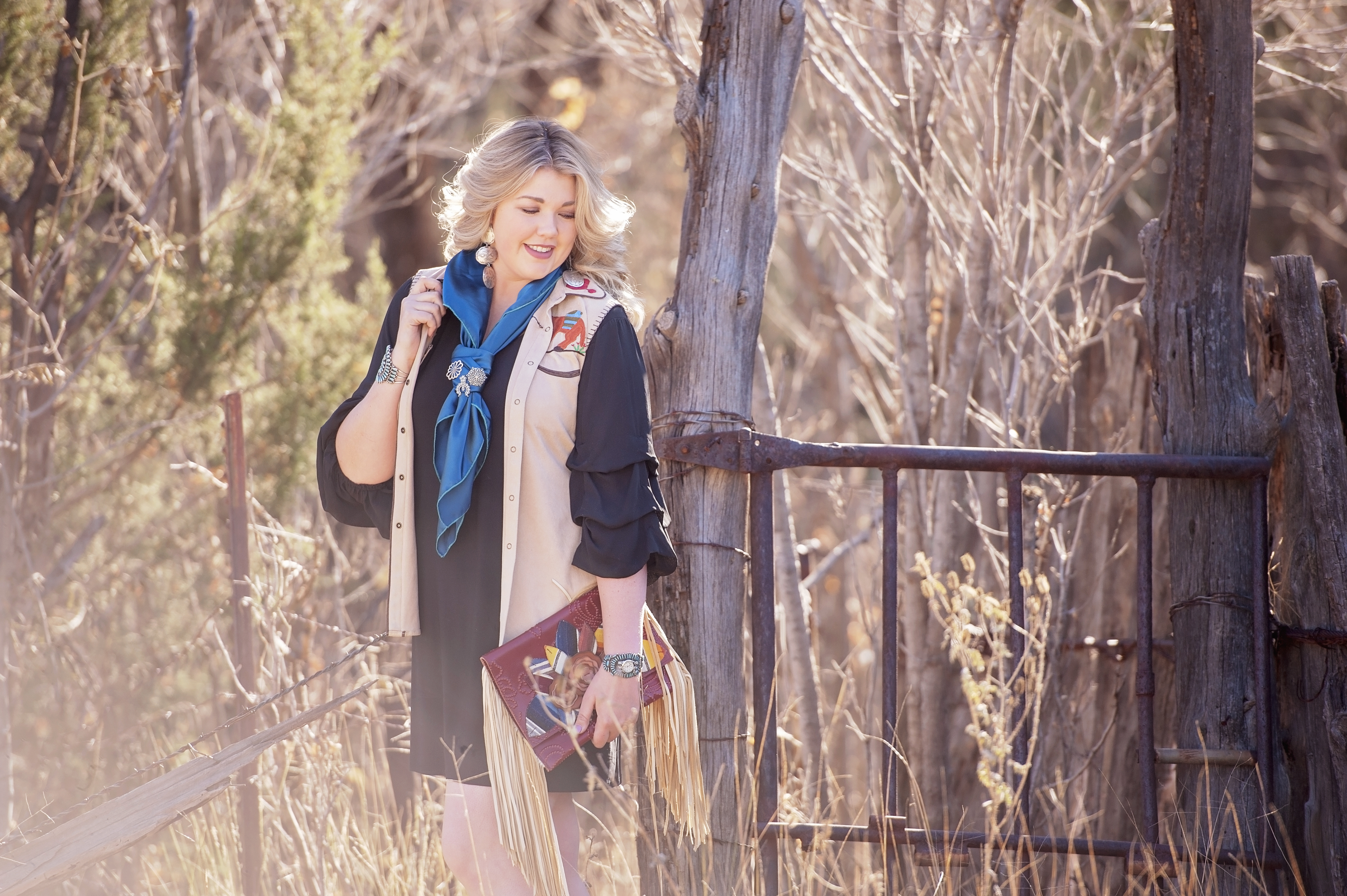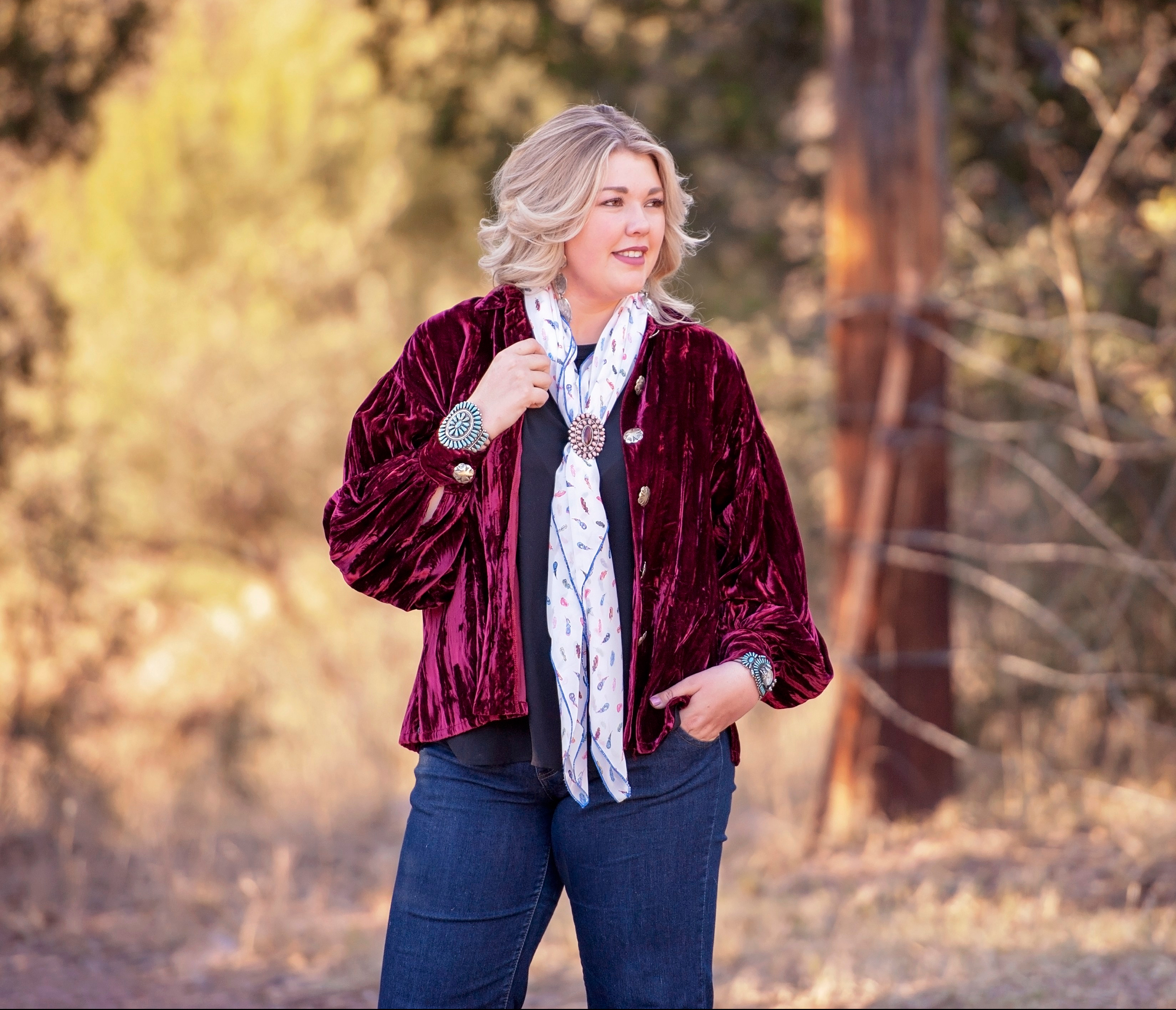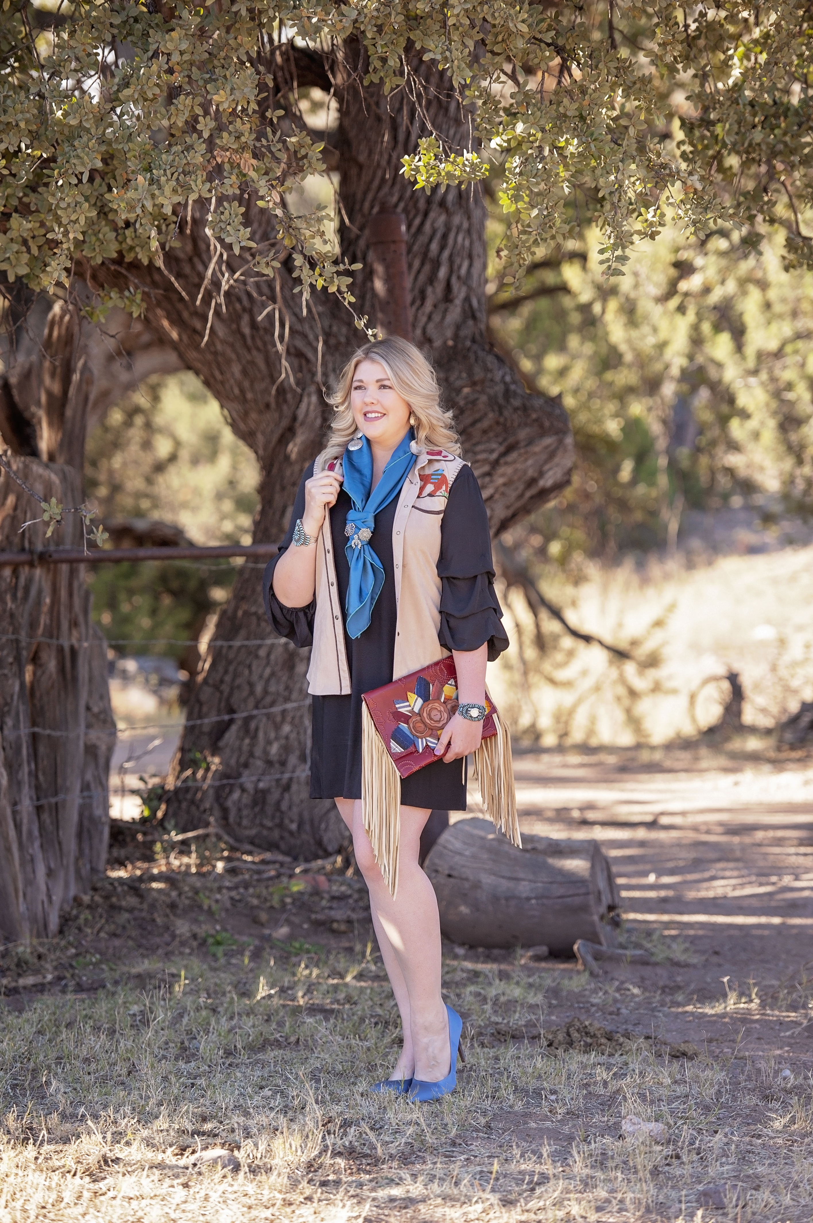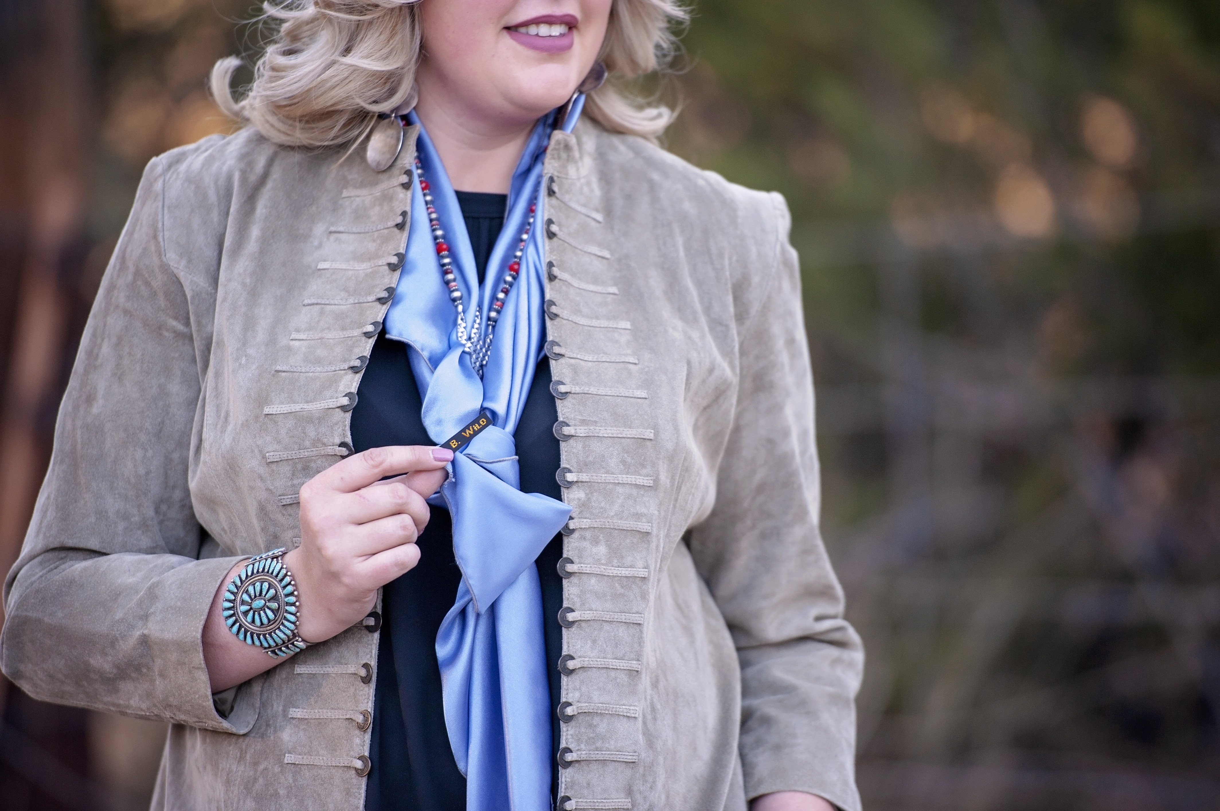 Rounding out the tips I have for this post is one of the most unique & fun ideas yet… I have a personal love for rich history (as if you may not have already picked up on that if you’ve followed my adventures for a while!)… I love the cowboy culture, I love the western heritage, I really love the southwest & what it has to offer in so many aspects, including the history of our turquoise & silver jewelry. In recent years, I’ve expanded that appreciation beyond my favorite squash blossoms etc & now have an affinity for unique pins… So many ideas for their re-purposing in my wardrobe, which I’m sure I’ll cover at a later date… But today, I bring my final tip for this post – Find some fun pins & let the statement makers stand alone or cluster some smaller beauties into a collage. Simply run the pin through the knot of your wild rag & be prepared to have yourself a conversation starter in the finished look!