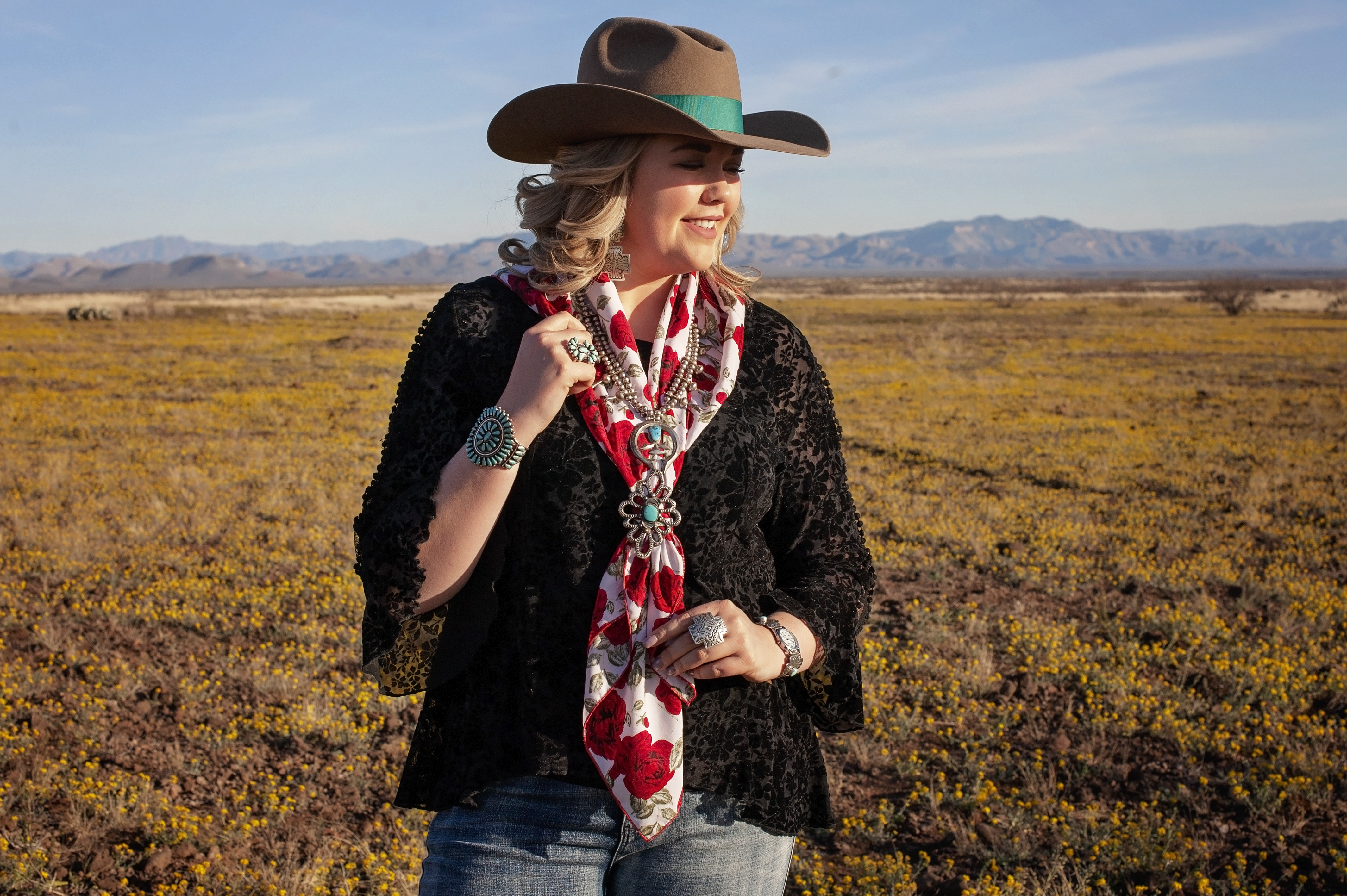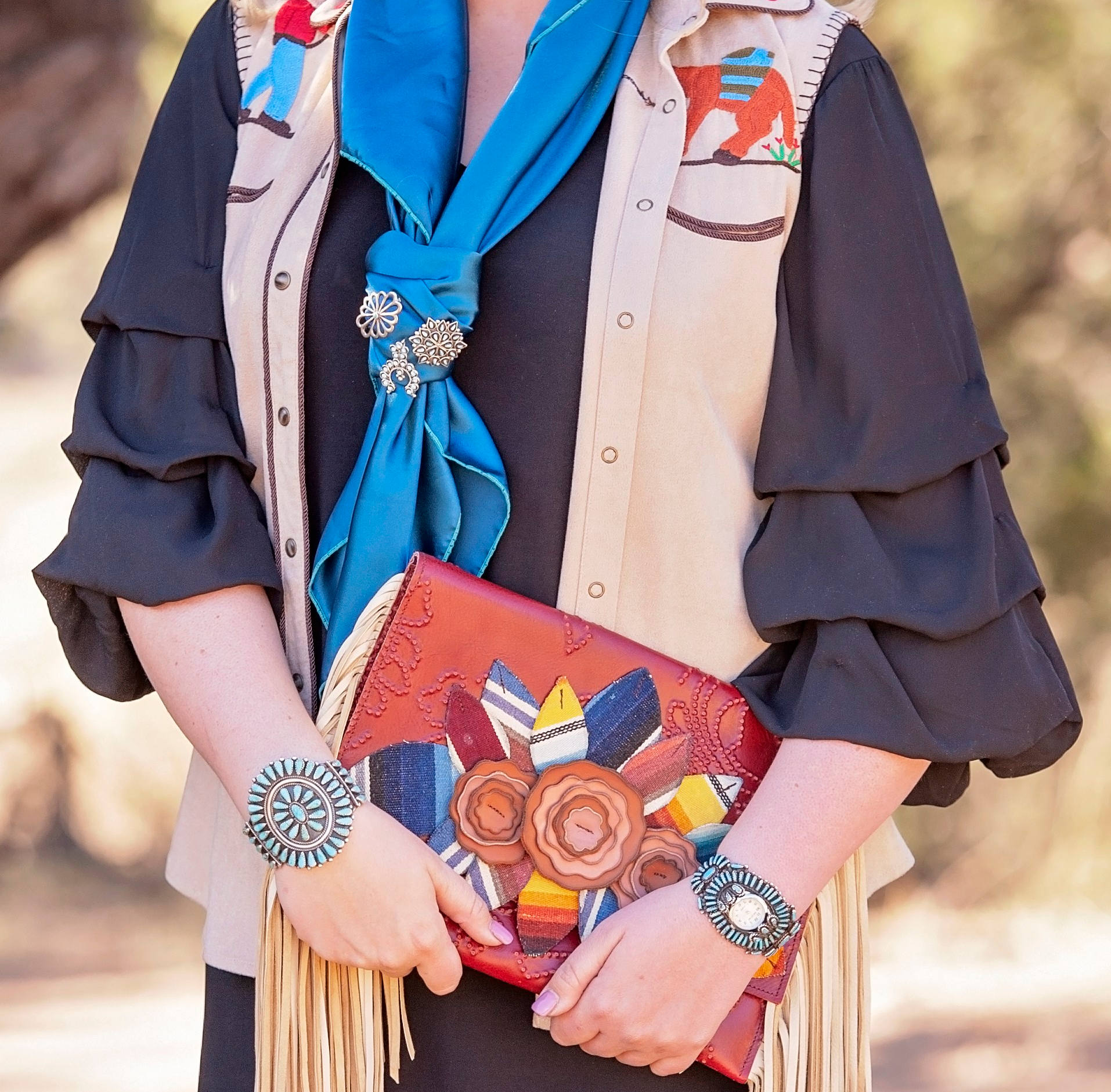 These long-loved staples of cowboy culture, with new patterns & ways to style, have been brought to light in the fashion scene too! Fully embracing the hundreds of ways to accessorize with a wild rag, whether you’re dressing for work (spring is branding season for many ranches!) or play, is the first step to adding zest & personality to your look. You can tie them all different ways, mix & match colors & patterns for a monochromatic or complimentary or even zany combination, & you can use your favorite jewels to add an extra element of beauty to these fun pieces of cowboy ware! A few of my personal preferences for jazzing them up outside of cowboy work are layering on necklaces & squash blossoms, using found objects & pins on the knots, & even finding unique pieces to wear as slides – leather, conchos, oversized rings & belt buckles (yes, you read that right!) serve the purpose! Read more on ways to wear here… “Wild Stylin’: Embellishing Wild Rags”